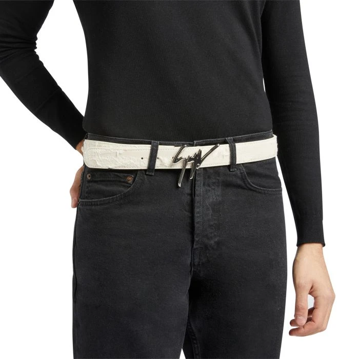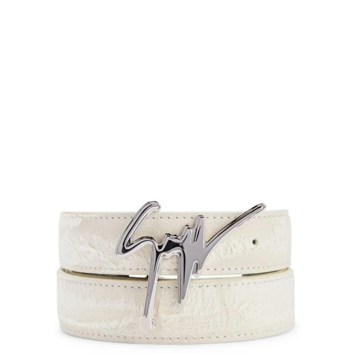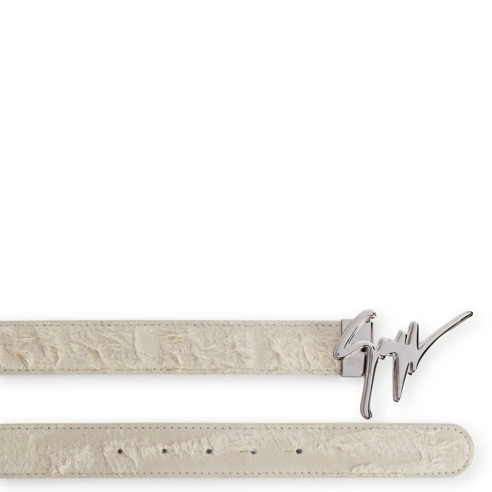 Belt crafted from white leather with ripped effect, featuring the iconic nickel-free metal ‘Signature’ buckle. This gender-neutral belt should be thread clockwise.