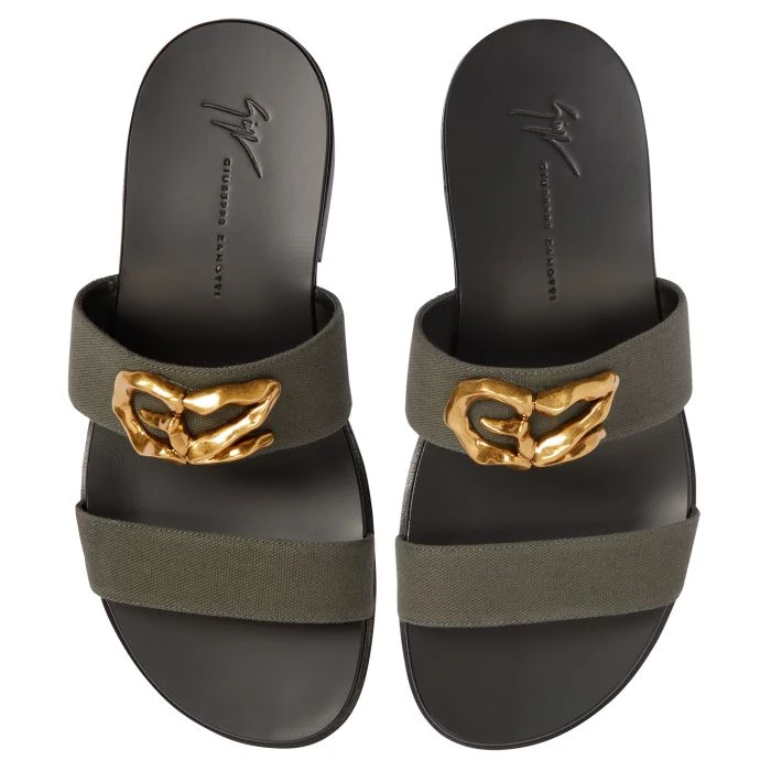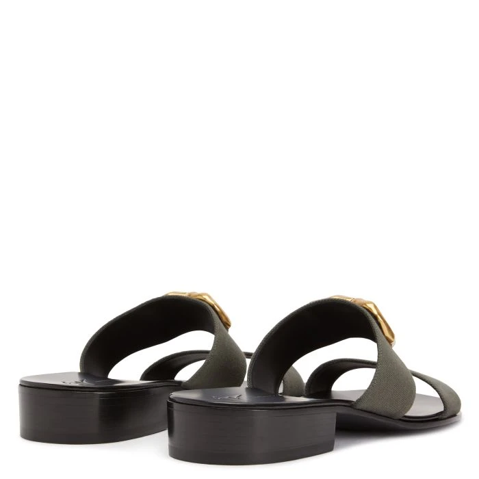 These flat sandals, crafted from army-green cotton with matching leather sole, are embellished by a metal ‘Logozalì’ with a gold antique finish detail on the upper band.