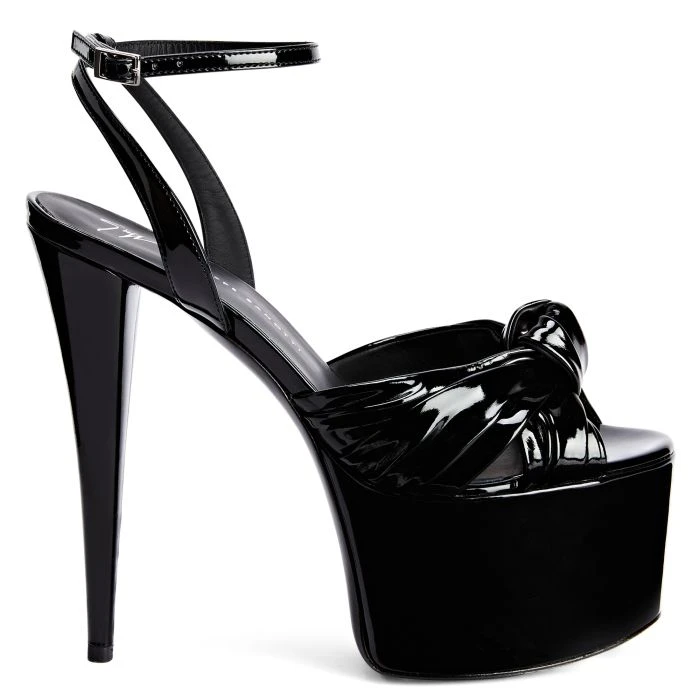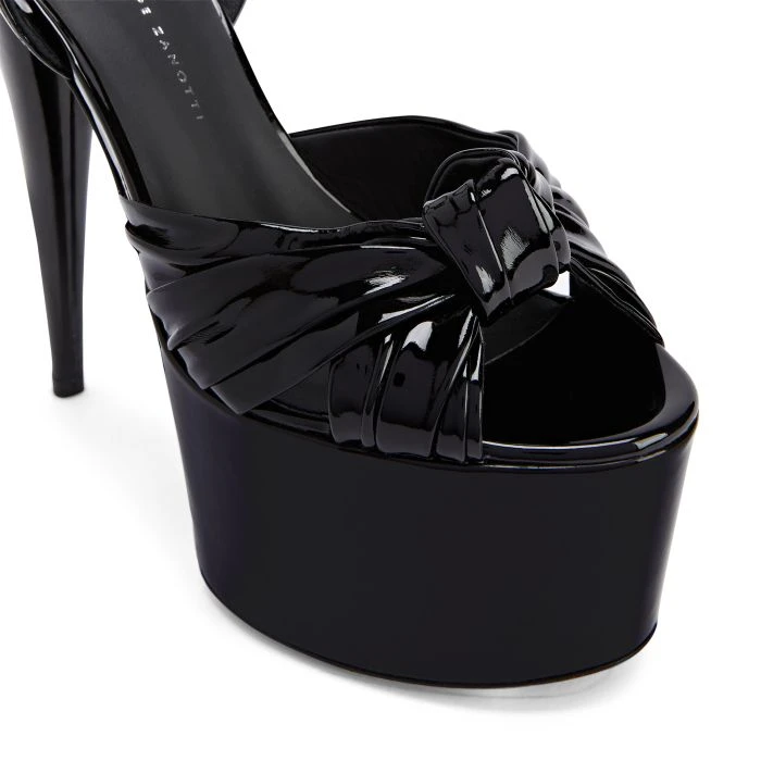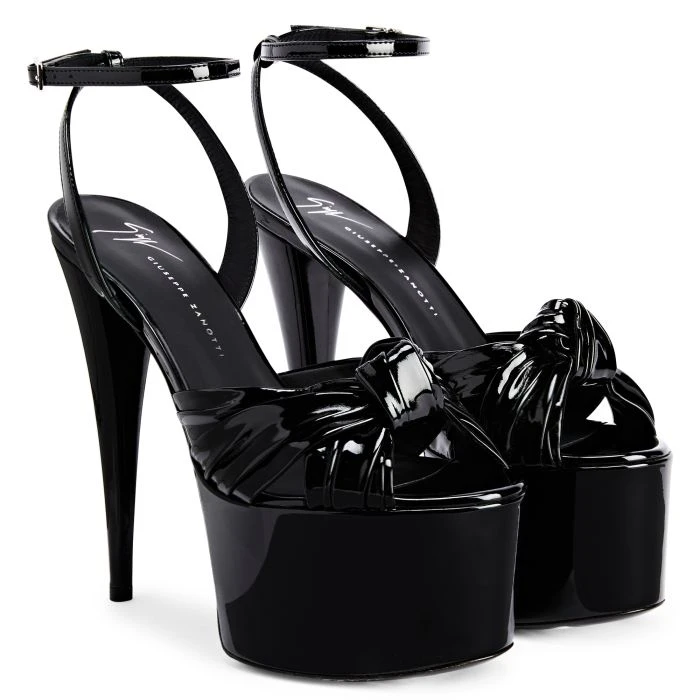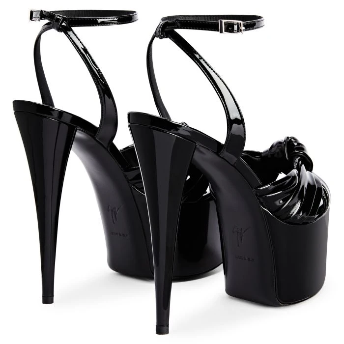 These open-toe sandals, crafted from black synthetic fabric with a patent leather effect, feature black leather soles, knotted front straps and adjustable ankle straps with small silver metal side buckles. The matching covered platforms and stiletto heels give the design a perfect finish.