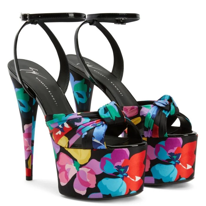 These open-toe sandals, crafted from pure silk with a multicoloured floral print, feature black leather soles, knotted front straps and patent leather-effect synthetic fabric adjustable ankle straps with small silver metal side buckles. The matching covered platforms and stiletto heels give the design a perfect finish.