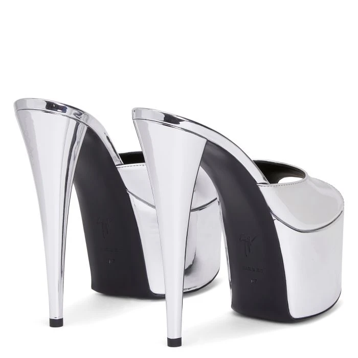 - 150 mm heel covered in silver mirror-effect synthetic fabric