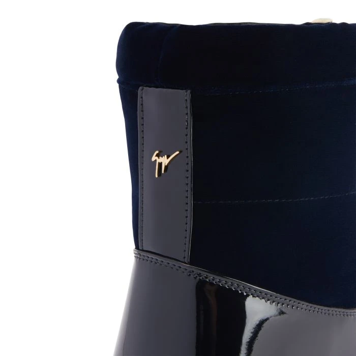 Snow boots crafted from blue-navy fabric with velvet effect and black synthetic fabric with patent effect, featuring a comfortable black faux fur inner lining, a drawstring with a ‘GZ’ cord lock stopper to adjust the closure and a golden metal ‘Signature’ detail.