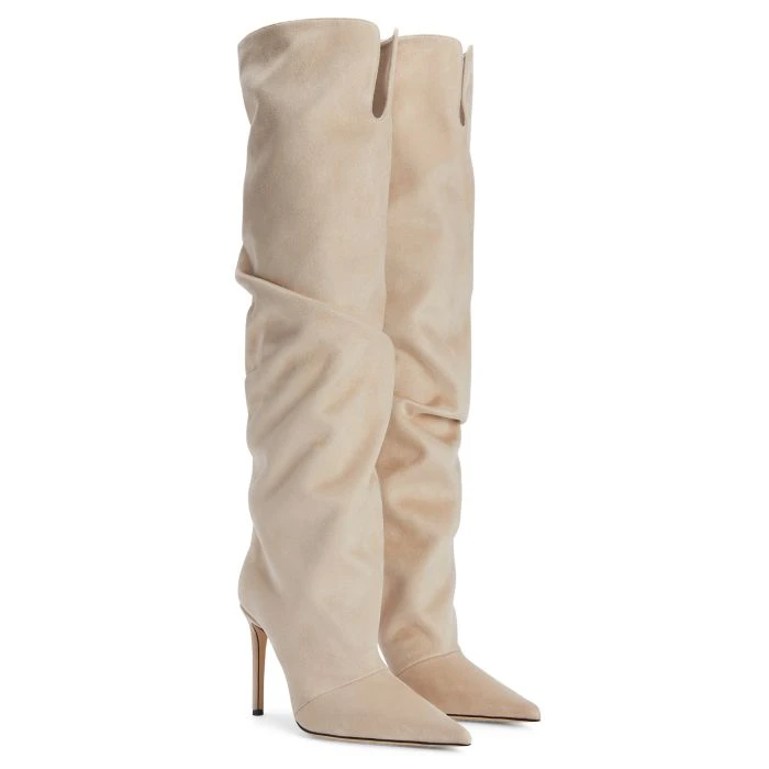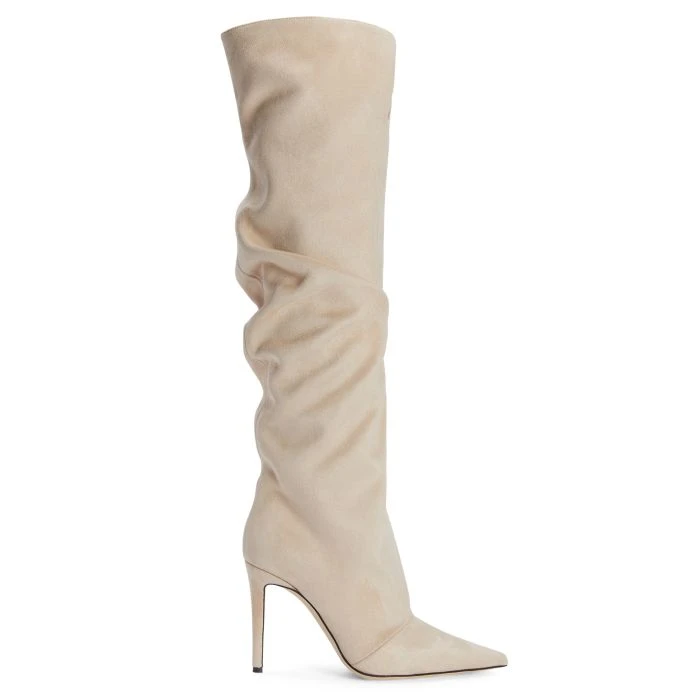 These knee-high, pointed-toe boots crafted from beige synthetic fabric with suede effect and leather sole feature a long soft shaft and matching covered stiletto heels.