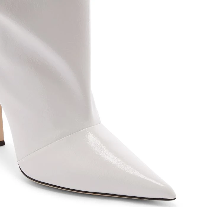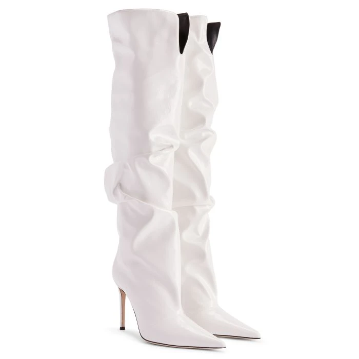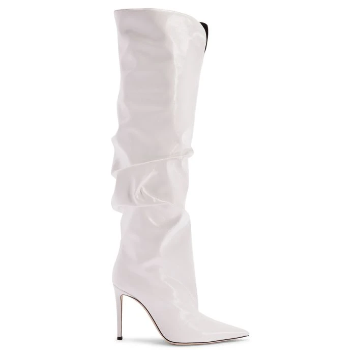 These knee-high, pointed-toe boots crafted from patent-effect white synthetic fabric feature a long soft shaft, matching covered stiletto heels and a leather sole.