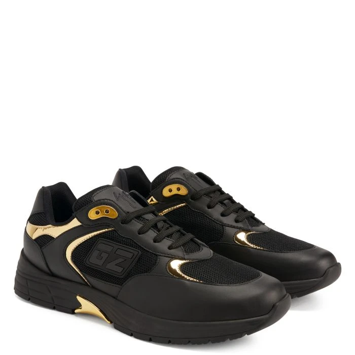 Low-top sneakers crafted from black leather, mesh and golden mirror-effect synthetic fabric details, featuring matching laces, white rubber ‘GZ’ side detail and black ‘Signature’ stitching on the tongue; the black TPU sole with a matching tread, detailed by shark fin-shaped elements, completes the high-tech design of these running-inspired shoes.