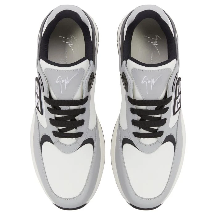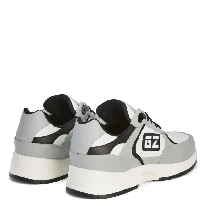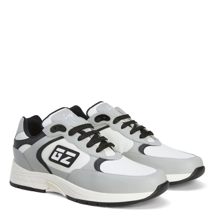 Low-top sneakers crafted from grey leather with black-and-white inserts, featuring black and white rubber ‘GZ’ side detail and white ‘Signature’ stitching on the tongue; the off-white TPU sole with a black tread, detailed by shark fin-shaped elements, completes the high-tech design of these running-inspired shoes.