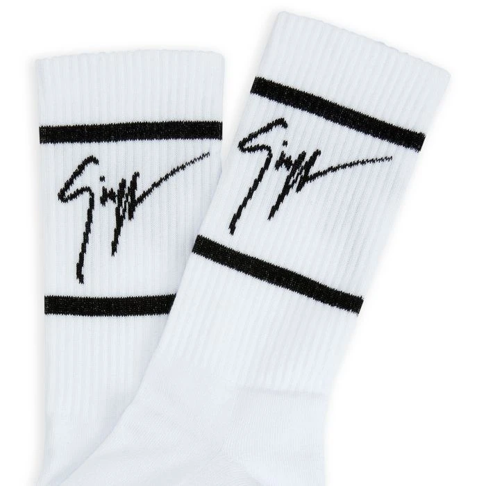 Socks crafted from white cotton blend fabric, featuring a black jacquard ‘Signature’ detail and matching jacquard stripes on the ankle.
