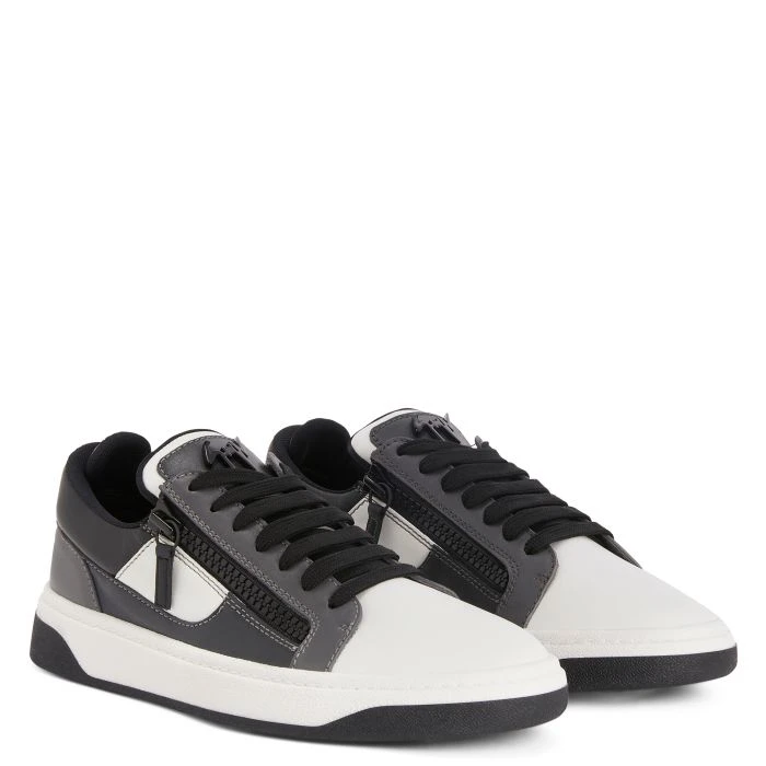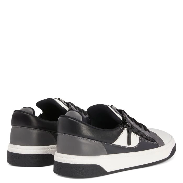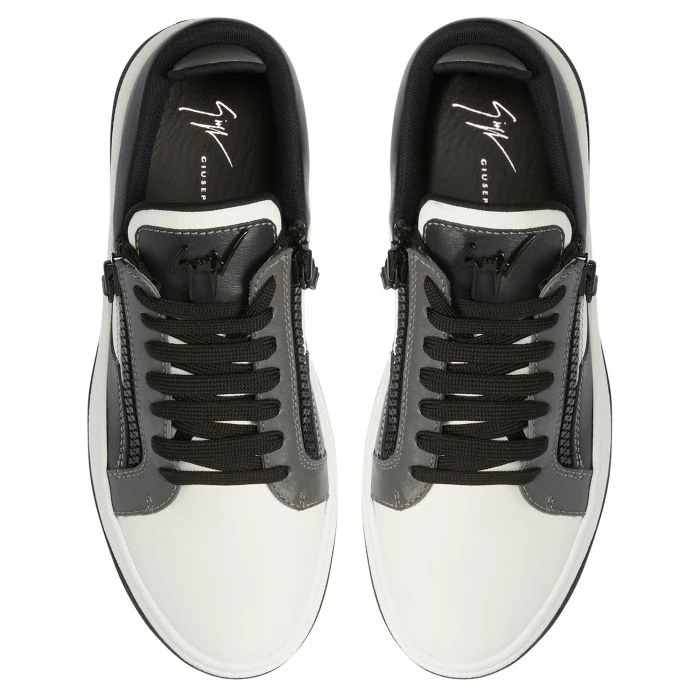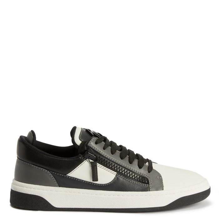 Sneaker crafted from white, dark-grey and black leather, with black cotton laces and a white rubber sole with black tread, featuring a grey lacquered metal ‘Signature’ and black plastic side zippers.