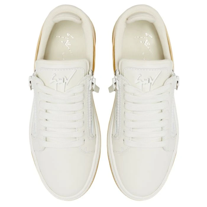 Sneakers crafted from white leather and golden synthetic fabric with a mirror effect, with matching cotton laces and white rubber soles with chromed golden treads, featuring white lacquered metal ‘Signature’ hardware and matching plastic side zippers.