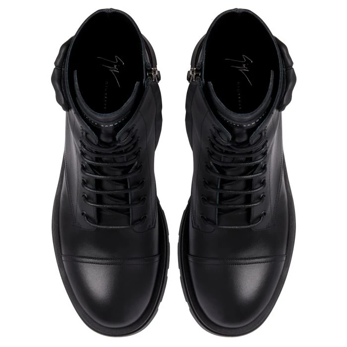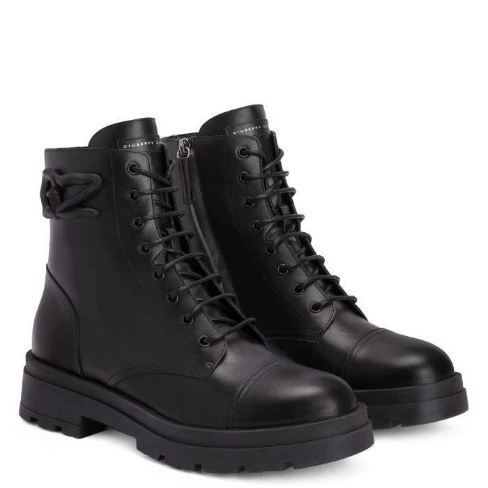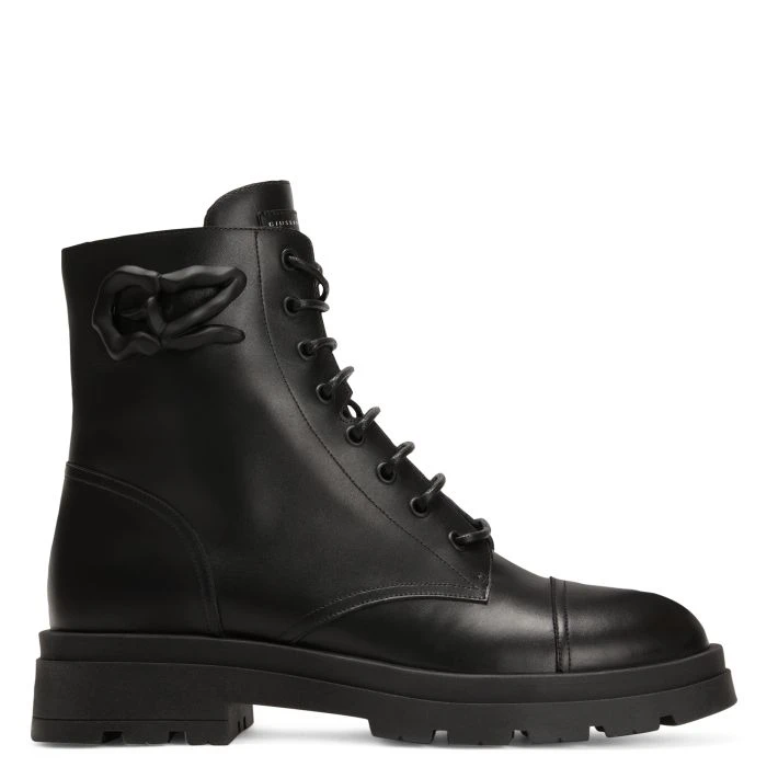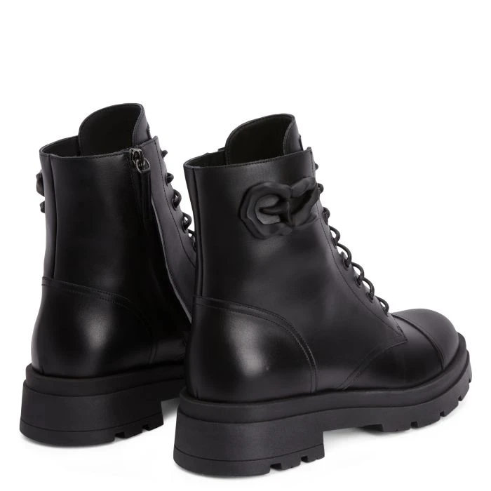 These lace-up biker boots, crafted from black leather with a leather inner lining and a colour-matching rubber sole, feature a black rubberised metal ‘Logozalì’ detail on the outer side of the shaft.