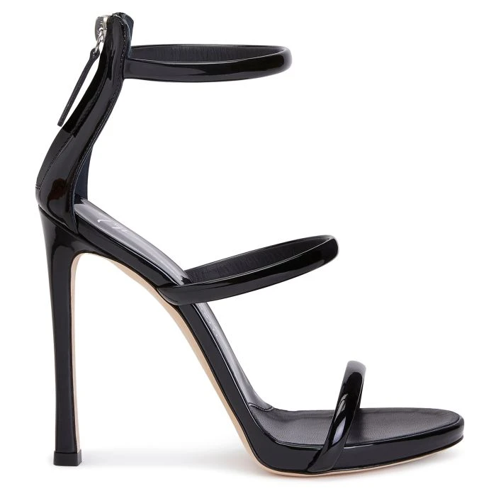 Sandals crafted from black synthetic fabric, featuring thin straps, a back zipper fastening with matching puller, matching covered stiletto heels with internal platform and leather soles with logo.