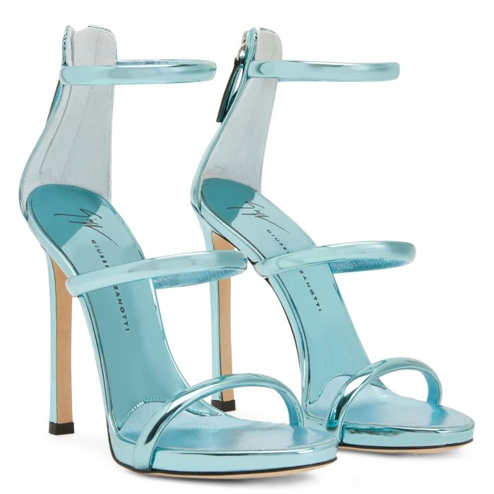 Sandals crafted from light-blue mirror-effect fabric, featuring thin straps, a back zipper fastening with matching puller, matching covered stiletto heels with internal platform and a leather sole with logo.