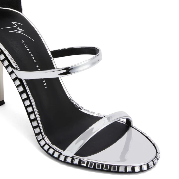 Sandals crafted from silver synthetic fabric with a mirror effect, thin straps and rear zipper fastenings with matching pullers, featuring matching covered stiletto heels and leather soles with edges embellished with crystal-coloured rhinestones.
