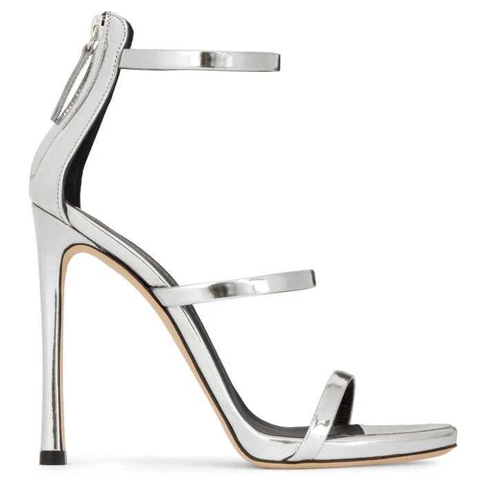 These high heel, silver mirrored leather three-strap sandals feature a small plateau and a covered heel in matching colour. They fasten on the back with a zipper, and are set on a leather sole with logo.