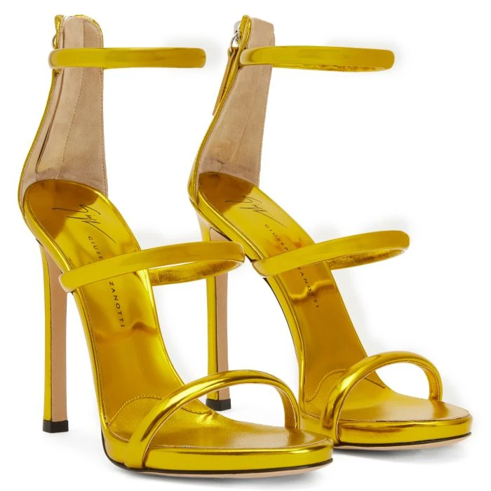 Sandals crafted from yellow mirror-effect leather, featuring thin straps, a back zipper fastening with matching puller, matching covered stiletto heels with internal platform and a leather sole with logo.