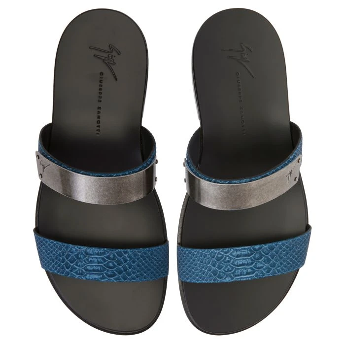 These slide sandals, crafted from blue python-print leather with a black leather sole, feature a metal plaque with a silver antique finish on the upper band.