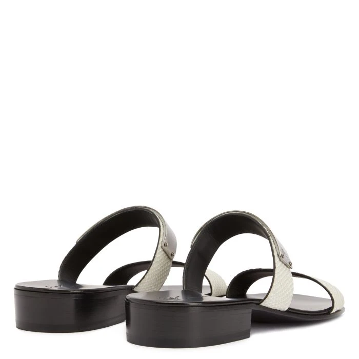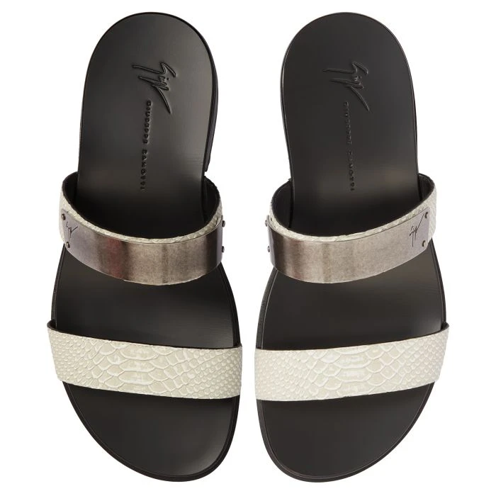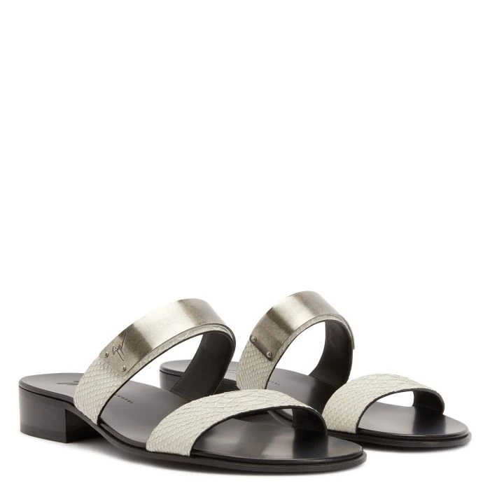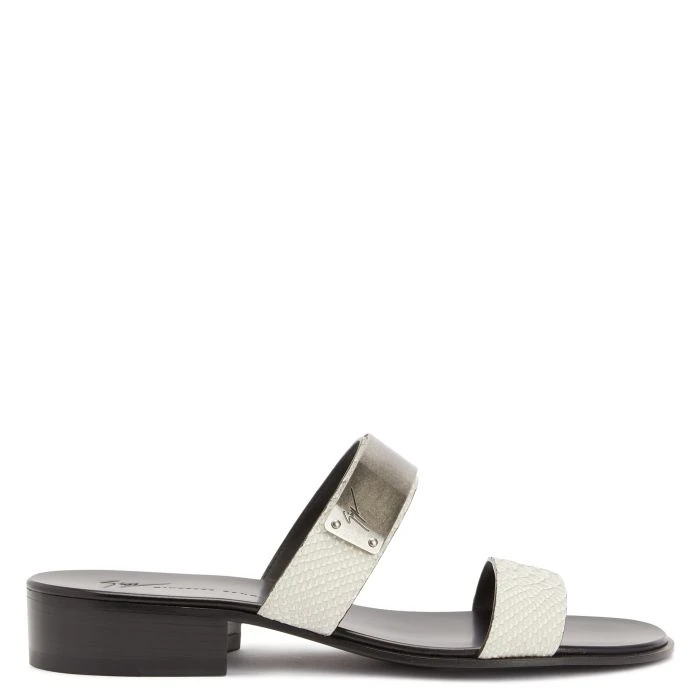 These slide sandals, crafted from off-white python-print leather with a black leather sole, feature a metal plaque with a silver antique finish on the upper band.