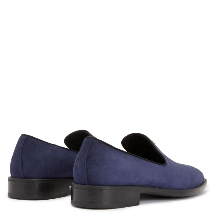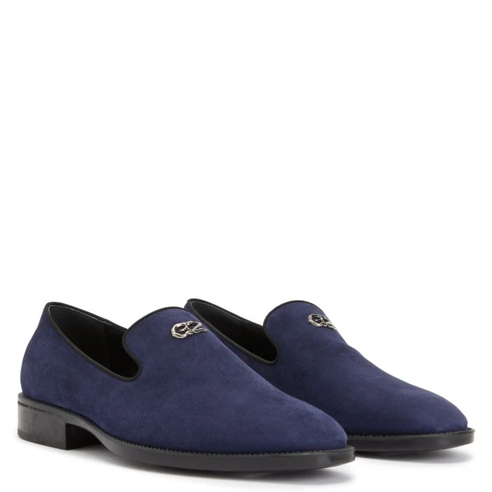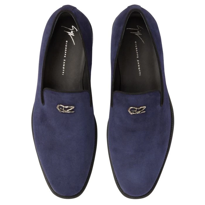 These loafers, crafted from dark-blue suede with black synthetic fabric trims, feature a leather sole and leather inner lining and are embellished with a metal ‘Logozalì’ detail with antique silver finish.