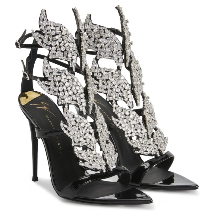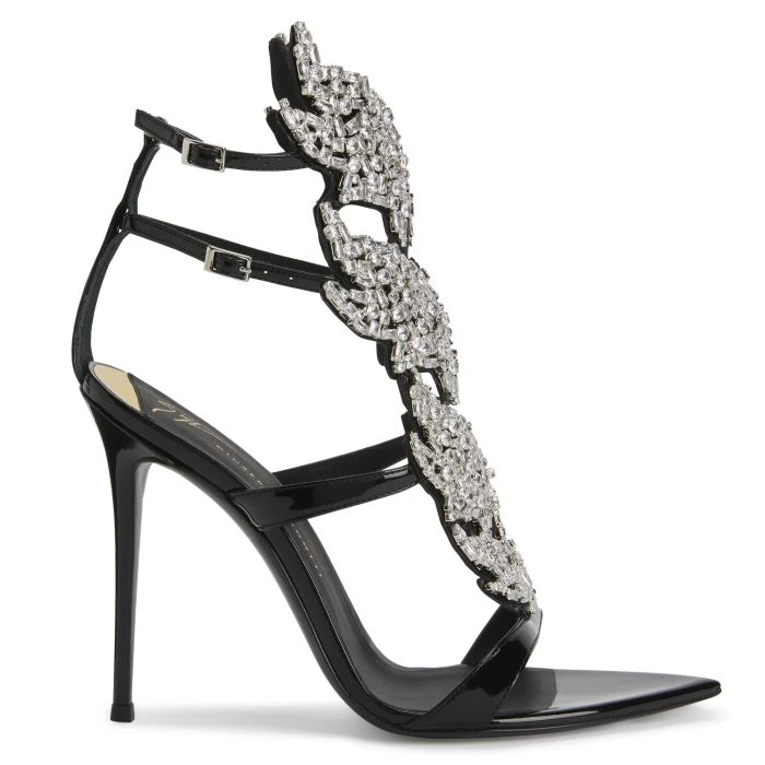 These pointed-toe pumps are crafted from black synthetic fabric with a patent leather effect, and feature adjustable ankle straps with buckles embellished with silver metal hardware and crystal-coloured rhinestones. The matching covered stiletto heels and leather soles embellished with golden details give the design a perfect finish.