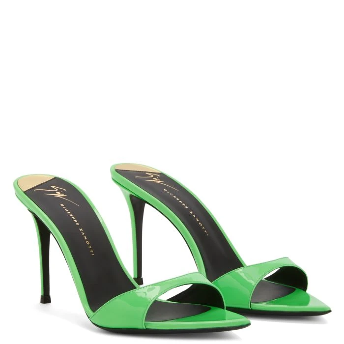These open and pointed toe mules are crafted from neon-green patent leather and feature a leather sole embellished with a golden detail and matching covered stiletto heels.