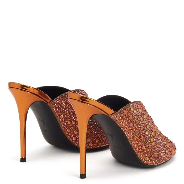 These pointed mules are crafted from copper-coloured synthetic fabric with a satin effect and feature orange leather stiletto heels with a mirror effect, black leather soles and an upper embellished with an all-over orange rhinestone embroidery.