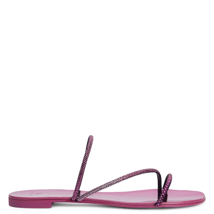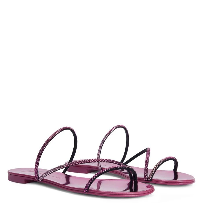 Crafted from black suede, this flat sandals feature thin straps decorated with an embroidery of mini pink rhinestones and are characterised by a pink laminated leather sole with logo.