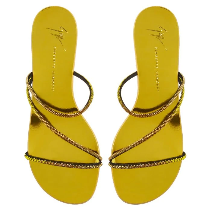 Crafted from black suede, these flat sandals feature thin straps decorated with an embroidery of mini yellow rhinestones and are characterised by a yellow laminated leather sole with logo.