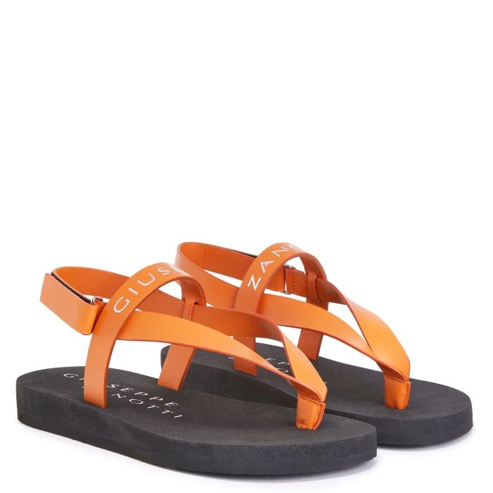 Orange leather thong sandals featuring a ‘Slogan’ detail in silver mirror-effect synthetic fabric, adjustable Velcro strap at the ankle and rubber sole.