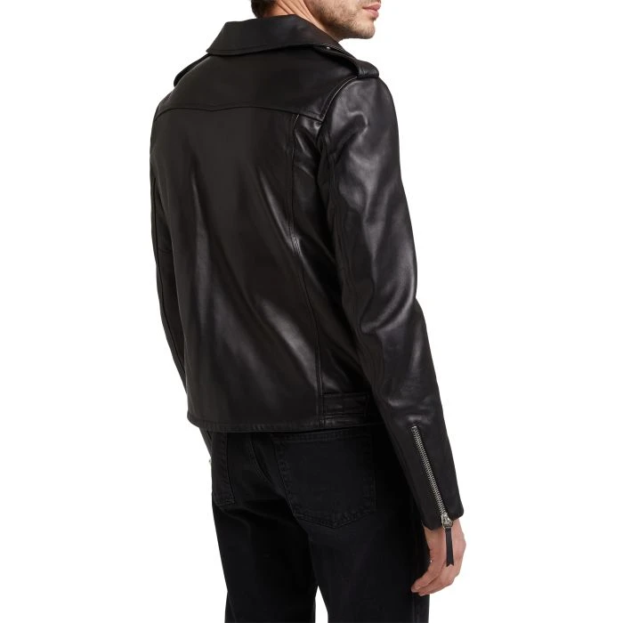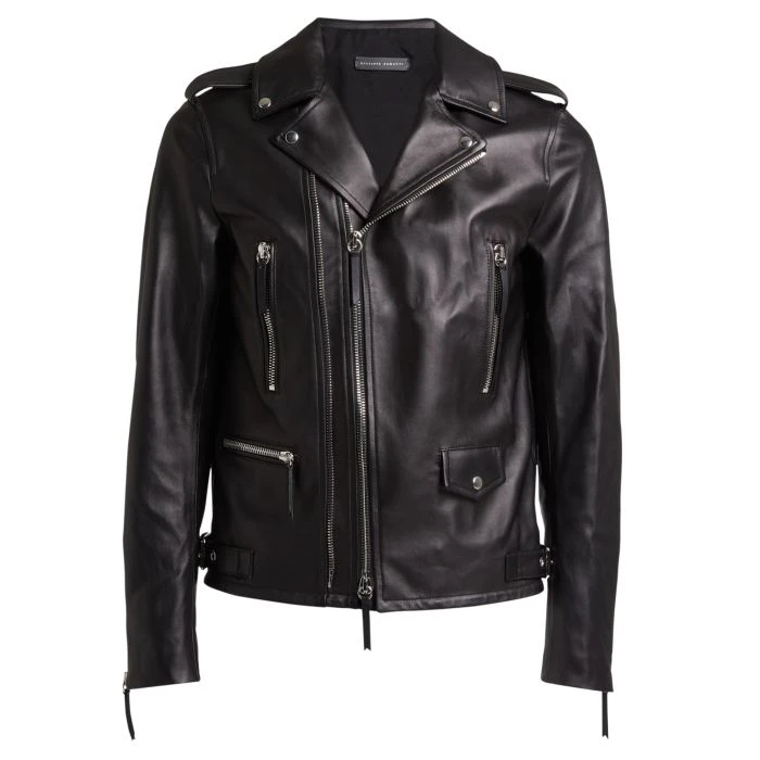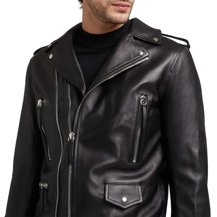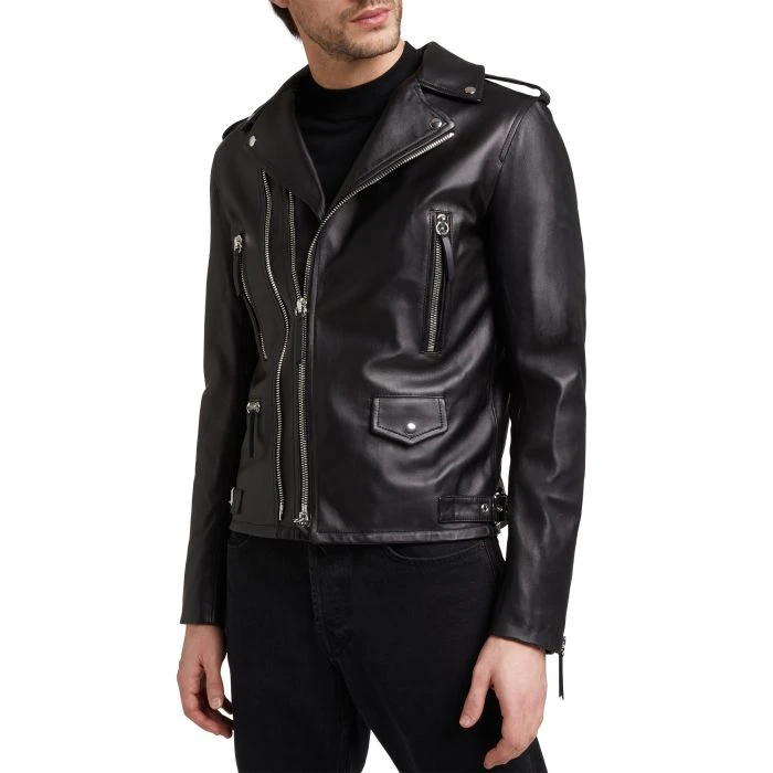 Black leather biker jacket with nickel metal zipper, front zipper pockets and adjustable buckle straps on the bottom sides. The iconic ‘Shark Tooth’ zipper puller accessory completes the design.