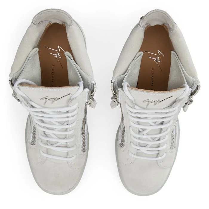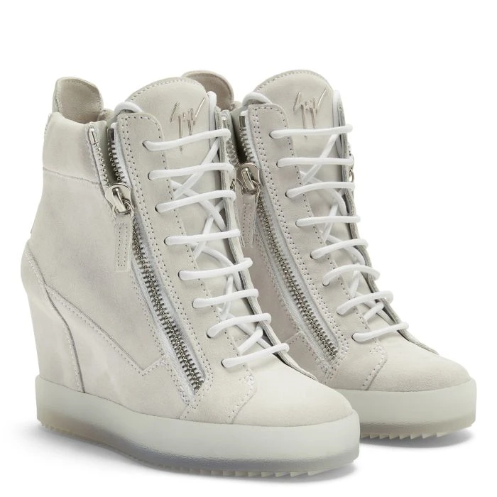 These high-top wedge sneakers are crafted from off-white velour with white cotton laces and feature a silver metal side zipper closure and a rubberised metal ‘Signature’ detail on the tongue; a transparent rubber sole with hidden wedge completes this sporty-chic model.