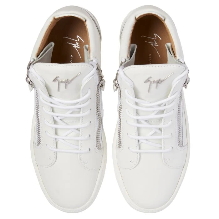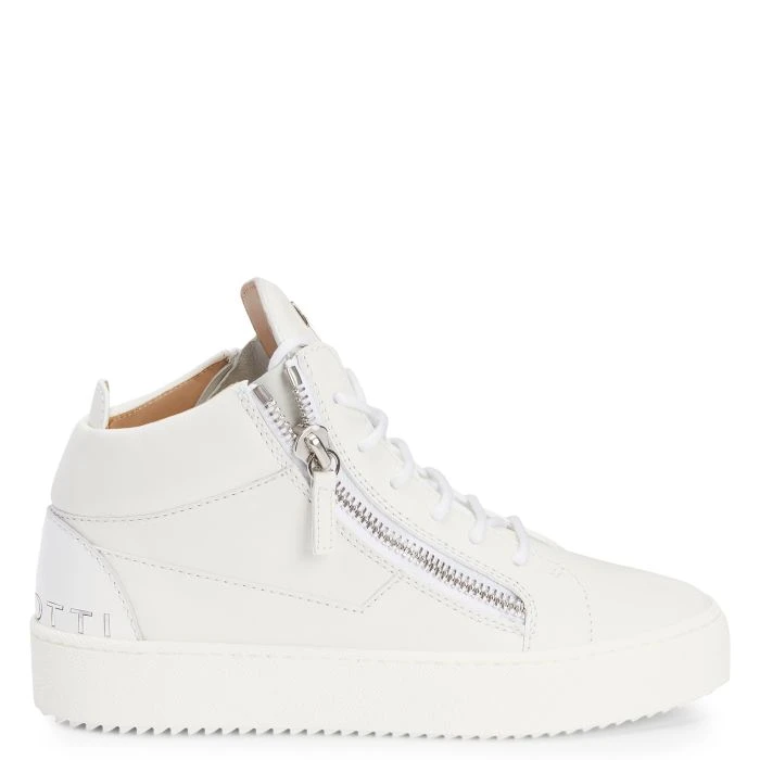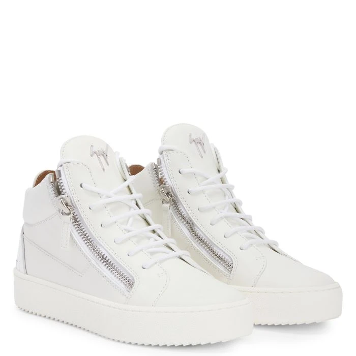 Mid-top sneakers crafted from white leather and patent leather with matching cotton laces, featuring a silver metal ‘Signature’ on the tongue, a silver mirror-effect fabric ‘Slogan’ detail on the heel and by matching side zipper closures on the upper; a white rubber sole completes the design of this model.