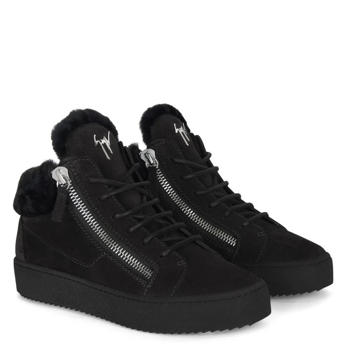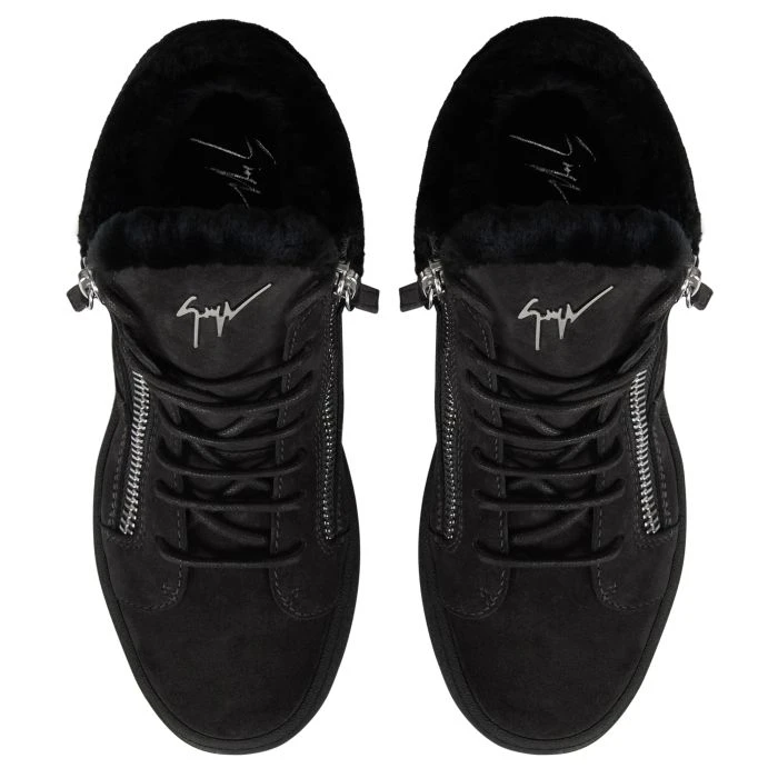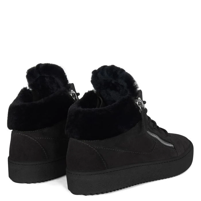 Mid-top trainers in black velour, with comfortable, tone-on-tone sheepskin inner lining, iconic silver metal ‘Signature’ detail, characteristic zip fastening at the sides and black rubber sole.