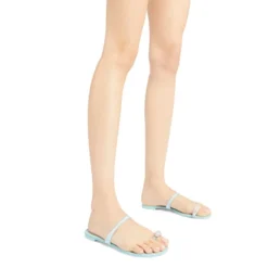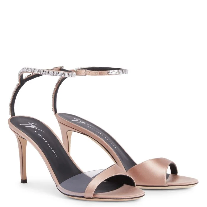 Open-toe sandals crafted from pink satin featuring a matching stiletto heels, a clear PVC insert on the front band and embellished with a silver metal, crystal jewel accessory running along the strap from ankle to heel.