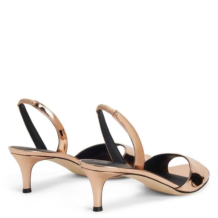 Slingback sandals in reflective rose gold synthetic fabric, with refined tone-on-tone covered kitten heel and leather sole.