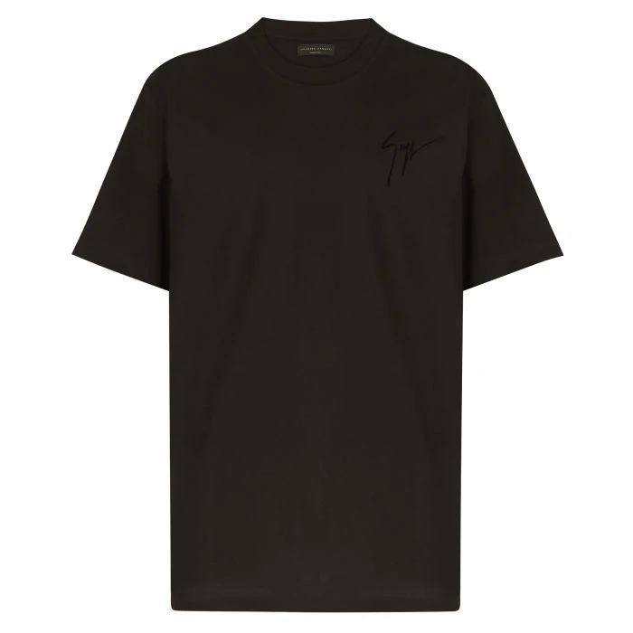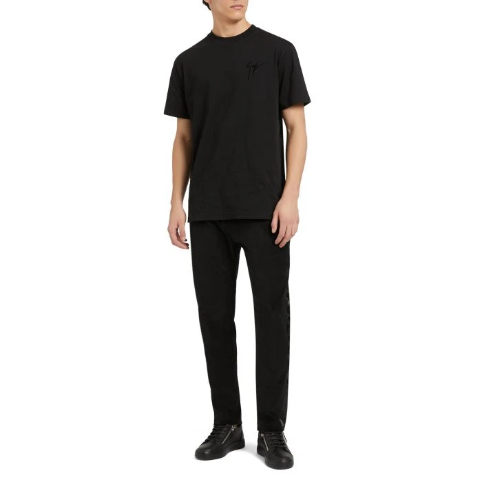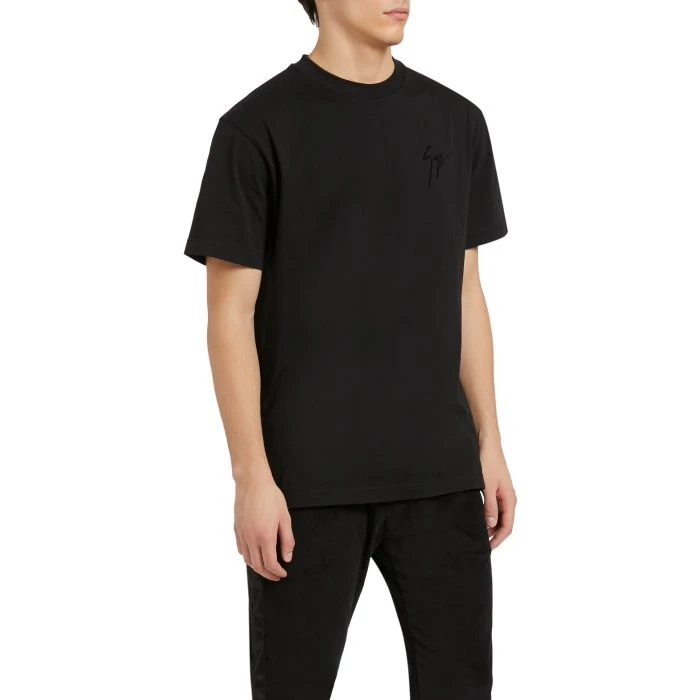 Crew-neck T-shirt in soft black cotton, complete with flocked, tone-on-tone embroidered Signature on the front and flocked, tone-on-tone Signature label on the back.