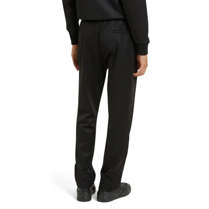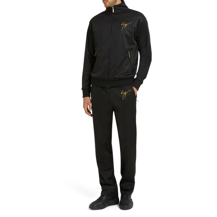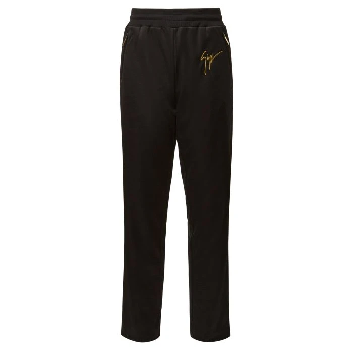 Black fabric sports trousers with elasticated waist, golden lurex thread-embroidered Signature on the front and zipped side pockets with golden metal pull.