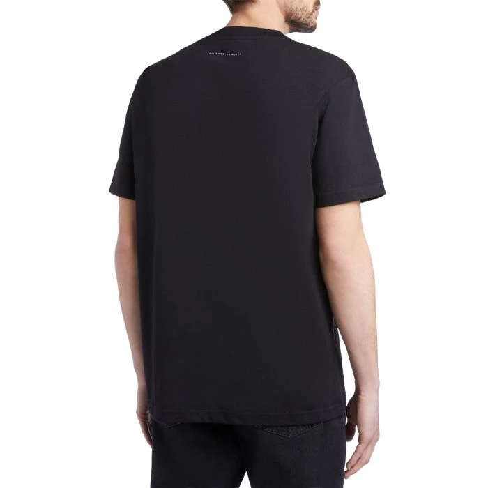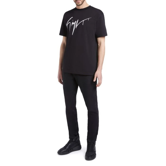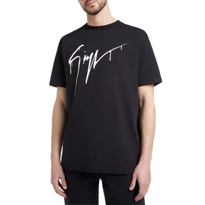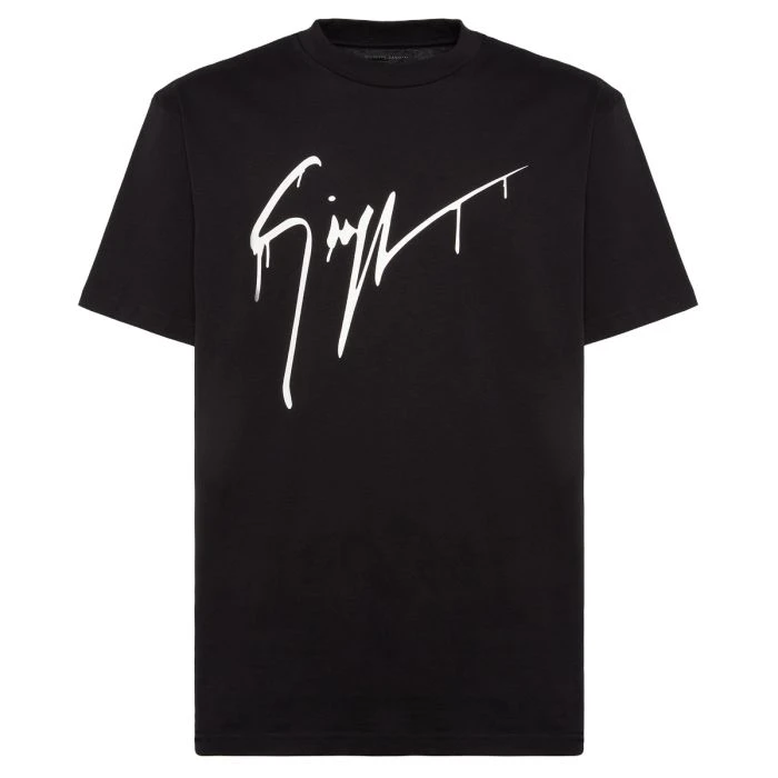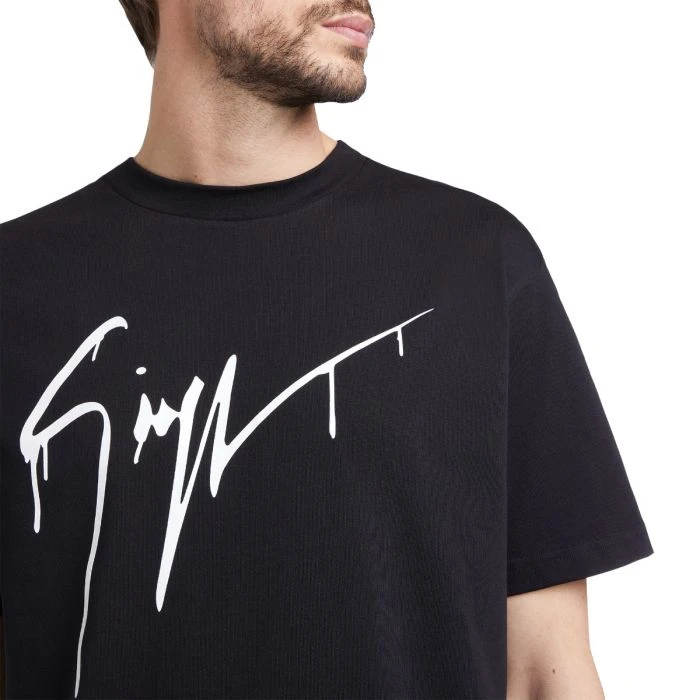 Black cotton crew-neck T-shirt featuring the Giuseppe Zanotti white logo print on the front and a white graffiti-style ‘Sprayed Signature’ print on the back.