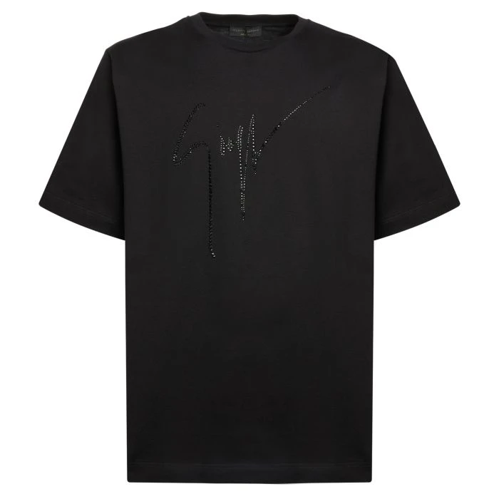 Crew-neck T-shirt crafted from pure black cotton, finished with matching rhinestone ‘Signature’ embroidery.