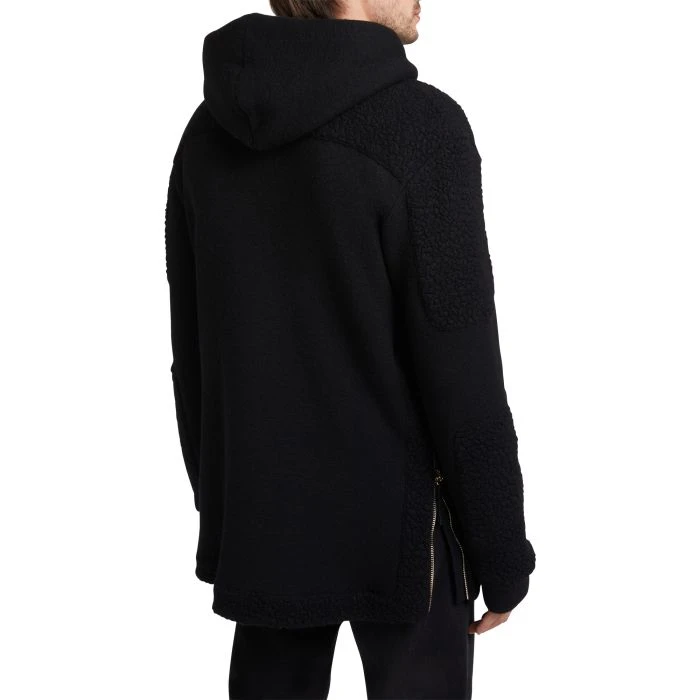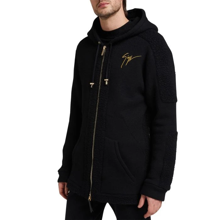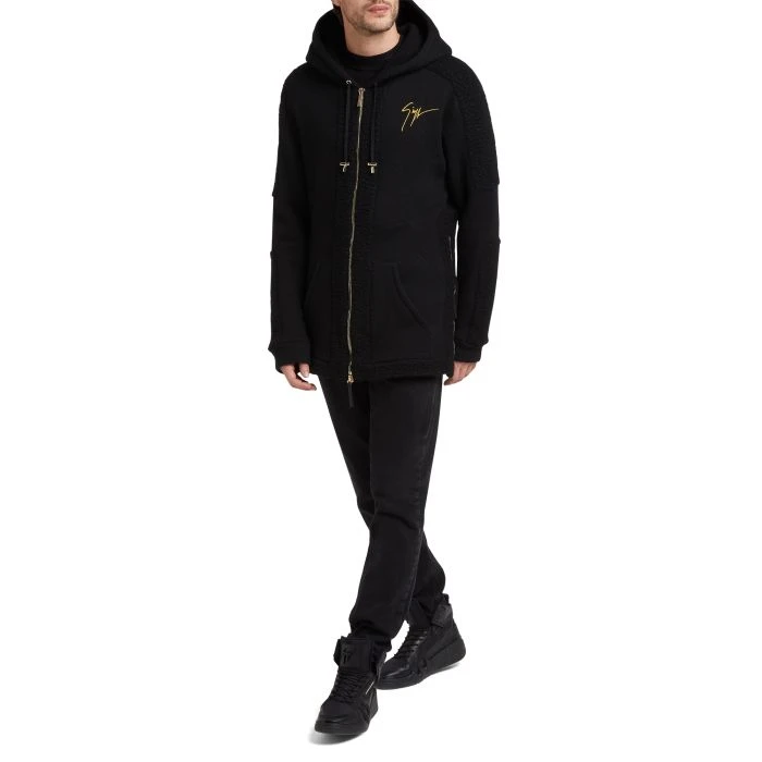 Hoodie crafted from unlined black wool blend fabric, with adjustable drawstring and elastic cuffs, featuring golden metal zipper details on the sides with leather pullers.