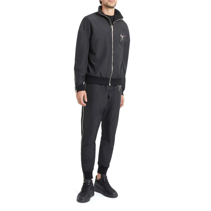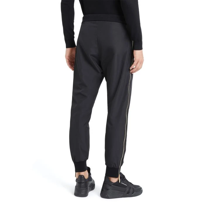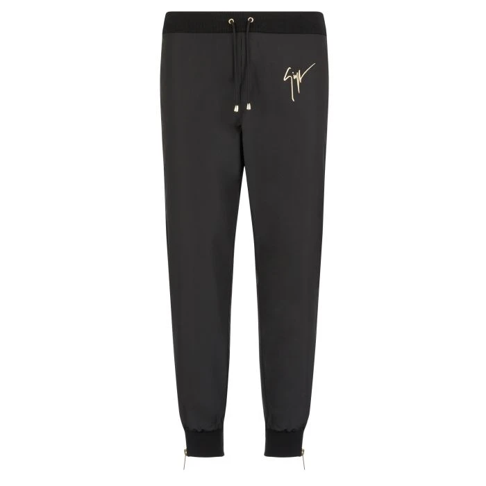 Tracksuit bottoms crafted from black nylon, with side pockets, a functional zipper piping in contrasting gold, elastic waistband and cuffs and a matching ‘Signature’ embroidery on the front.