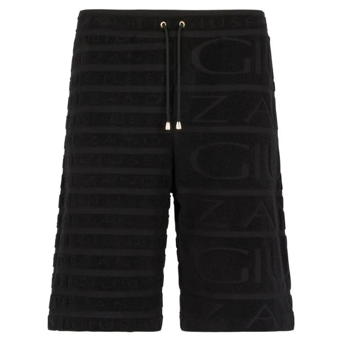 Sports shorts crafted from black terry cloth fabric with side pockets and back pocket, featuring a drawstring and with golden metal cord locks and a raised, striped pattern with ‘Signature’ details.