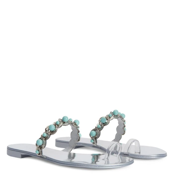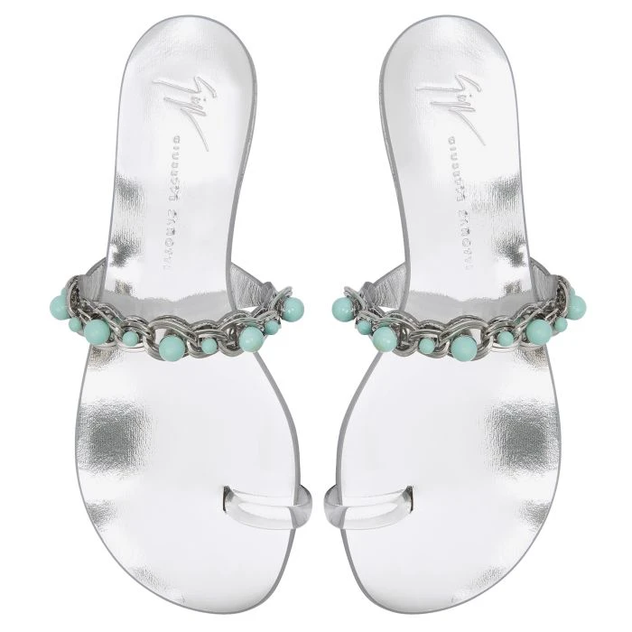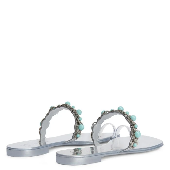 Flat thong sandals crafted from silver mirror-effect leather with a leather sole, featuring a clear PVC ring strap and a rear band embellished with a silver metal accessory with turquoise lacquered stones.