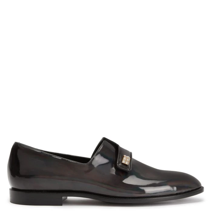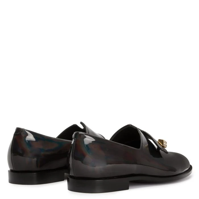 These loafers, crafted from grey laminated leather with leather interior and sole, are embellished with a golden metal ‘Pyramid’ jewel accessory with crystal rhinestones on the vamp.