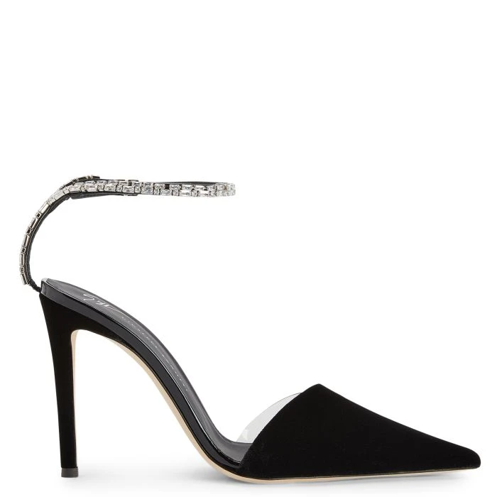 Sandals in black velvet with matching vinyl details, with crystal-coloured rhinestone jewel accessory on the back of the heel and on the front of the ankle strap. Stiletto heel and small buckle for adjustable closure.