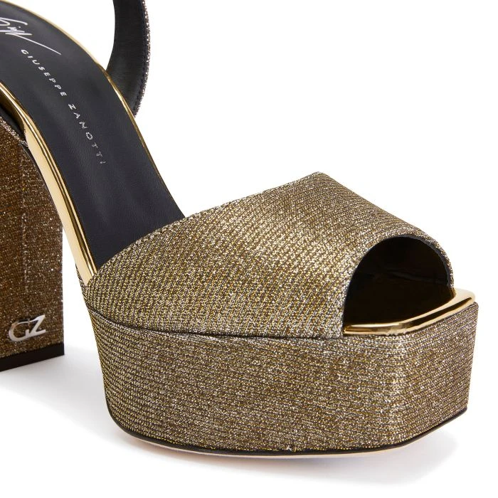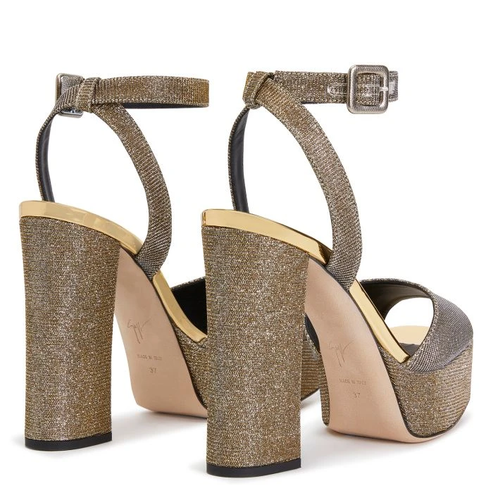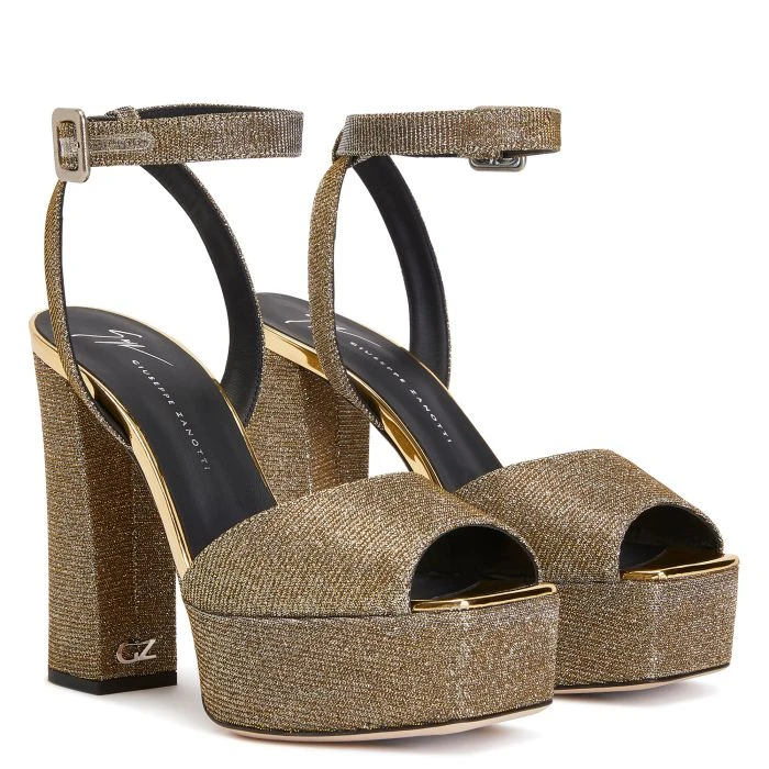 Open-toe sandals crafted from golden laminates synthetic fabric with chunky heels and matching platform; a strap with side buckle covered in golden laminated leather allows an adjustable ankle closure, while a small ‘GZ’ detail in golden metal applied to the inner heel gives the design a perfect finish.