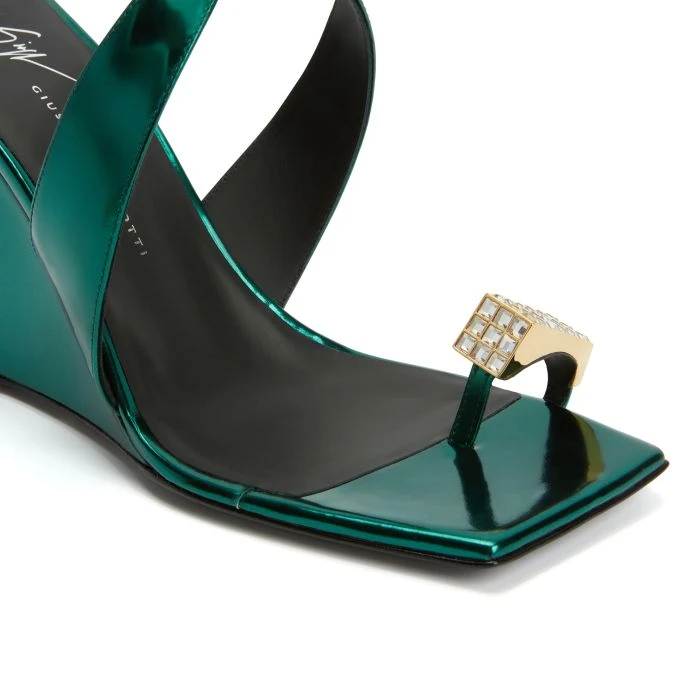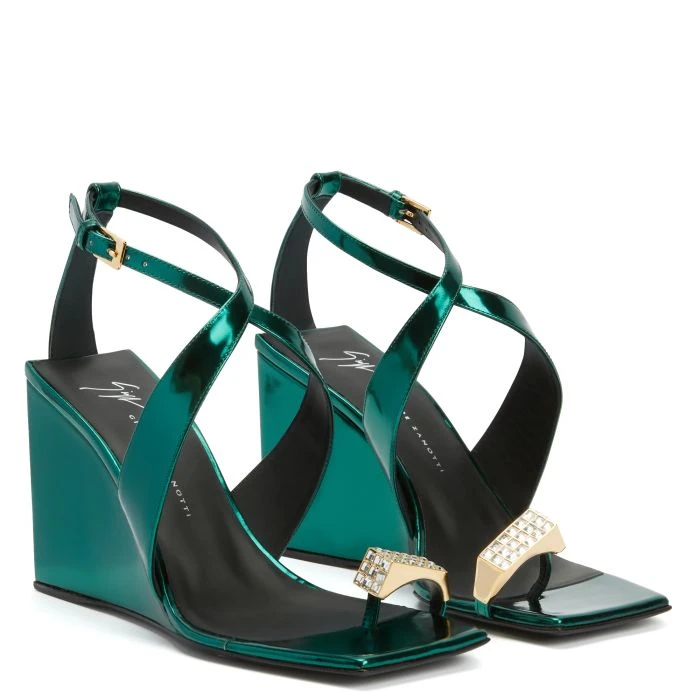 These thong sandals, crafted from emerald green leather with a mirror effect, feature matching covered wedges and black leather soles, a crossed strap that wraps around the instep up to the ankle where there is an adjustable strap with a small golden metal buckle, and are embellished with golden metal hardware with crystal-coloured rhinestones applied to the thong strap.