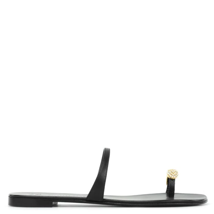 These sandals are made from matt black nappa leather. Adorned with a jewel embellishment, they are crafted with a single strap and toe loop. Set on a leather sole with logo.