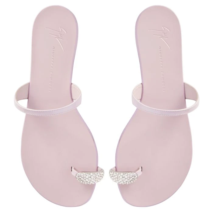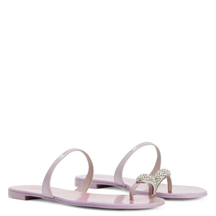 Flat thong sandals, crafted from lilac patent leather with matching glossy leather sole, characterised by essential lines and embellished with a silver metal jewel accessory with crystal-rhinestones on the ring strap.