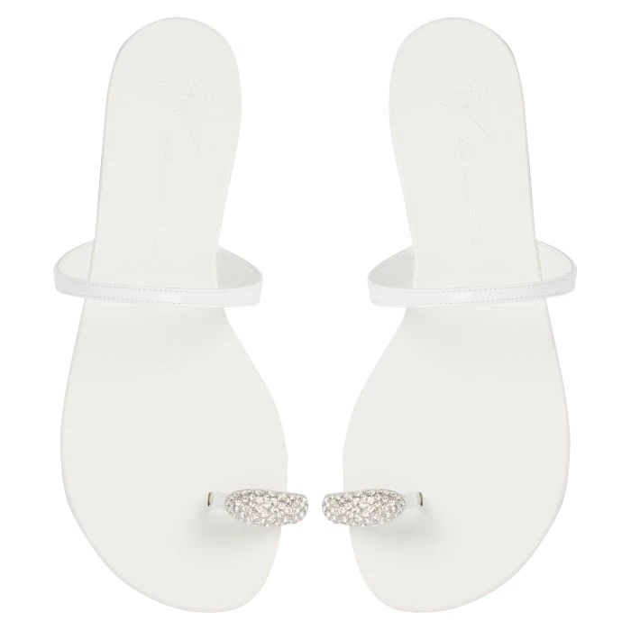 Flat thong sandals, crafted from white patent-effect synthetic fabric with matching glossy leather sole, characterised by essential lines and embellished with a silver metal jewel accessory with crystal-rhinestones on the ring strap.