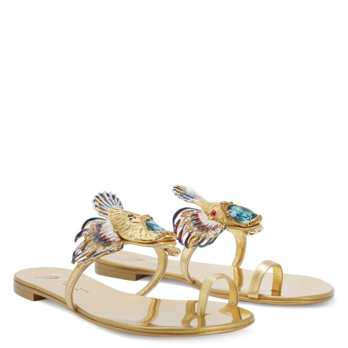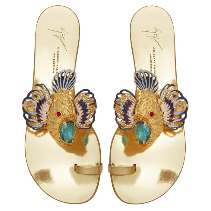 Presenting “Spipiott”, from the new “Giuseppe Zanotti Icons” project, the iconic sandal created in 2004, now updated in golden laminated leather and embellished with ‘Spipiott’ accessory covered in colourful crystals. A new chapter in style featuring timeless and utterly sophisticated pairs perfect for summer and glamorous occasions.
